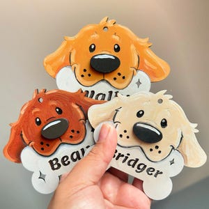 Each ornament is cut and etched onto 1/8 inch mdf and is hand painted with acrylic paint . Ornaments range from 4 to 5 inches . Mostly depends on dogs face :)