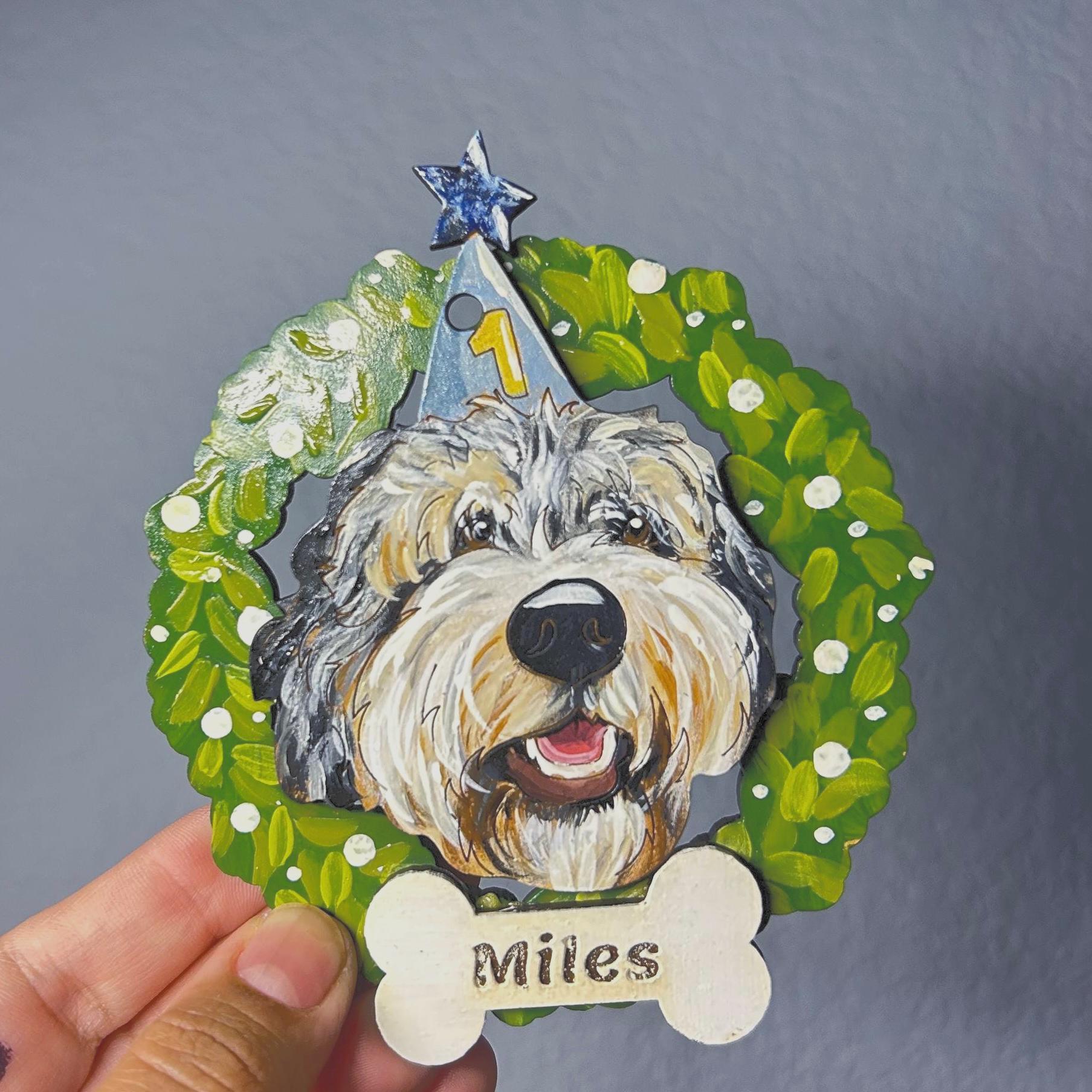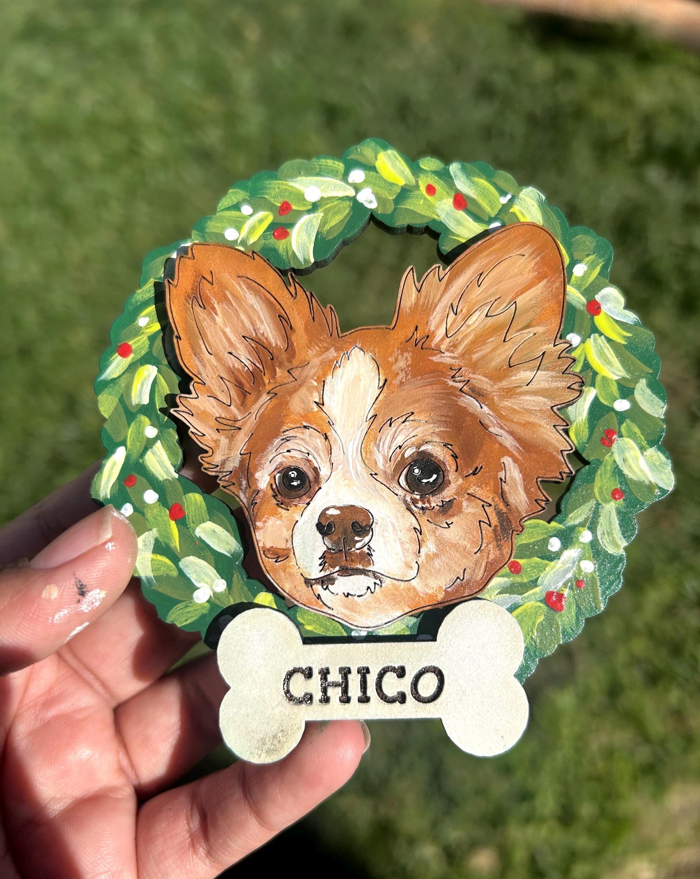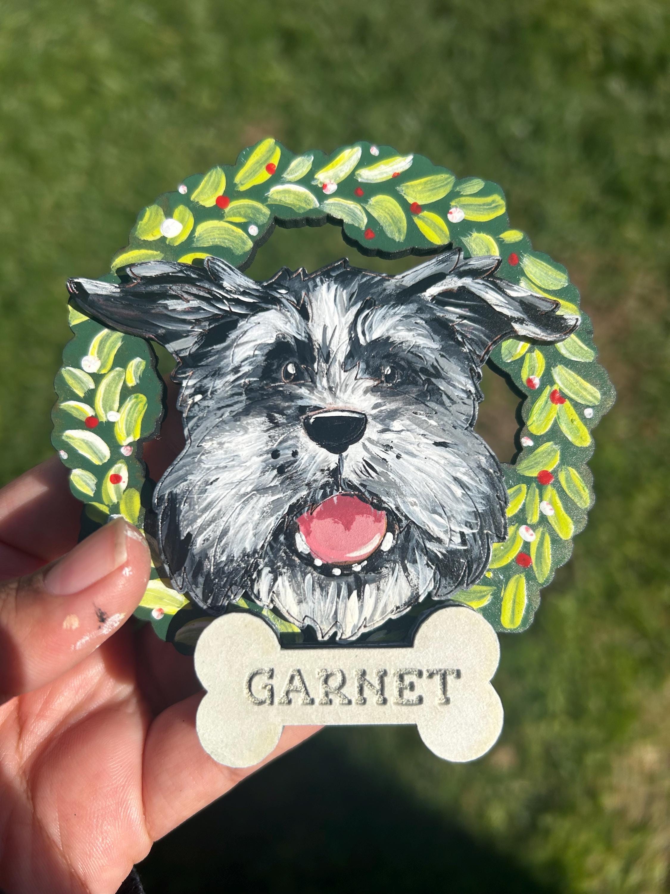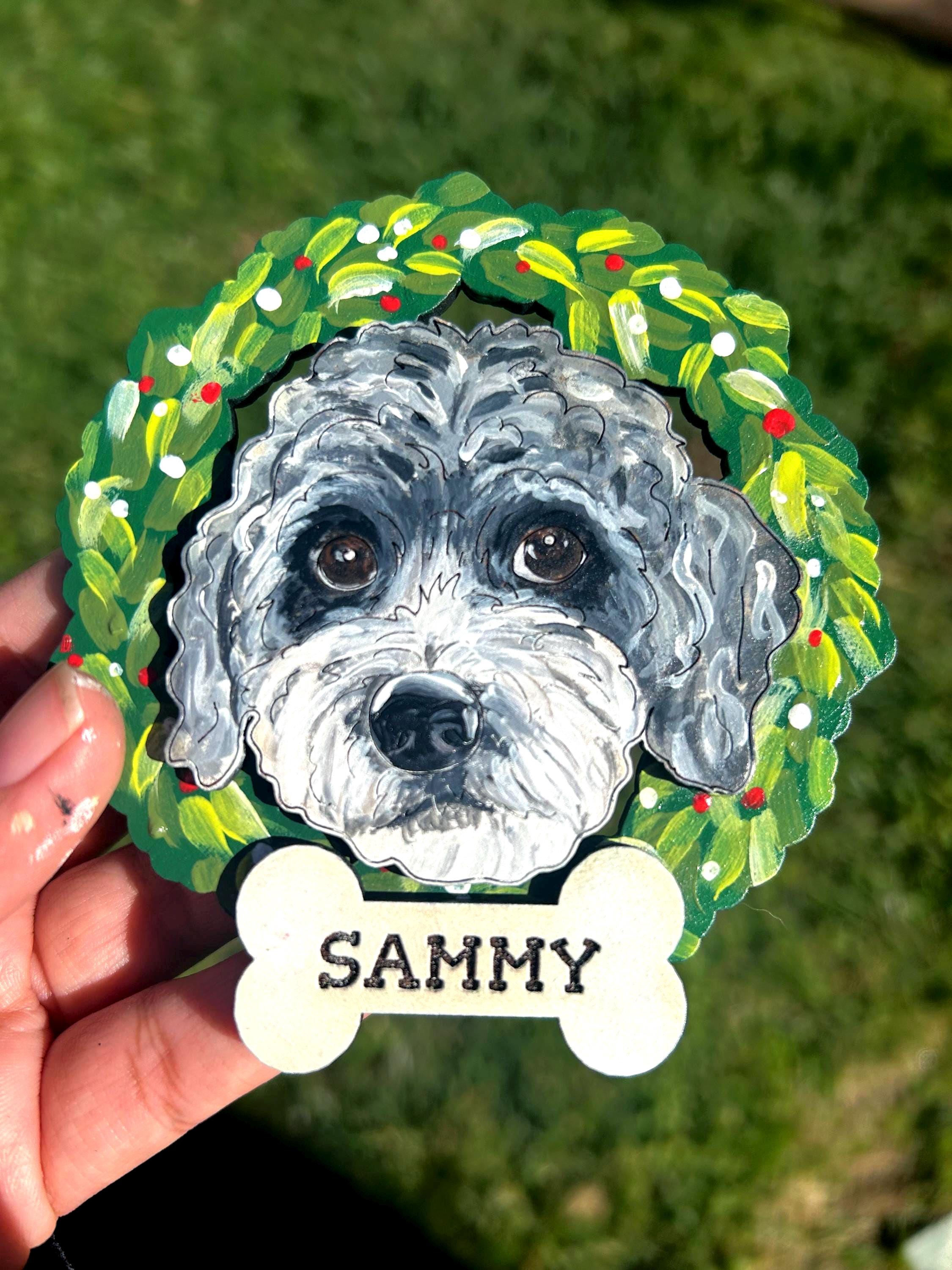 Each ornament is cut and etched onto 1/8 inch mdf and is hand painted with acrylic paint . Ornaments range from 4 to 5 inches . Mostly depends on dogs face :)