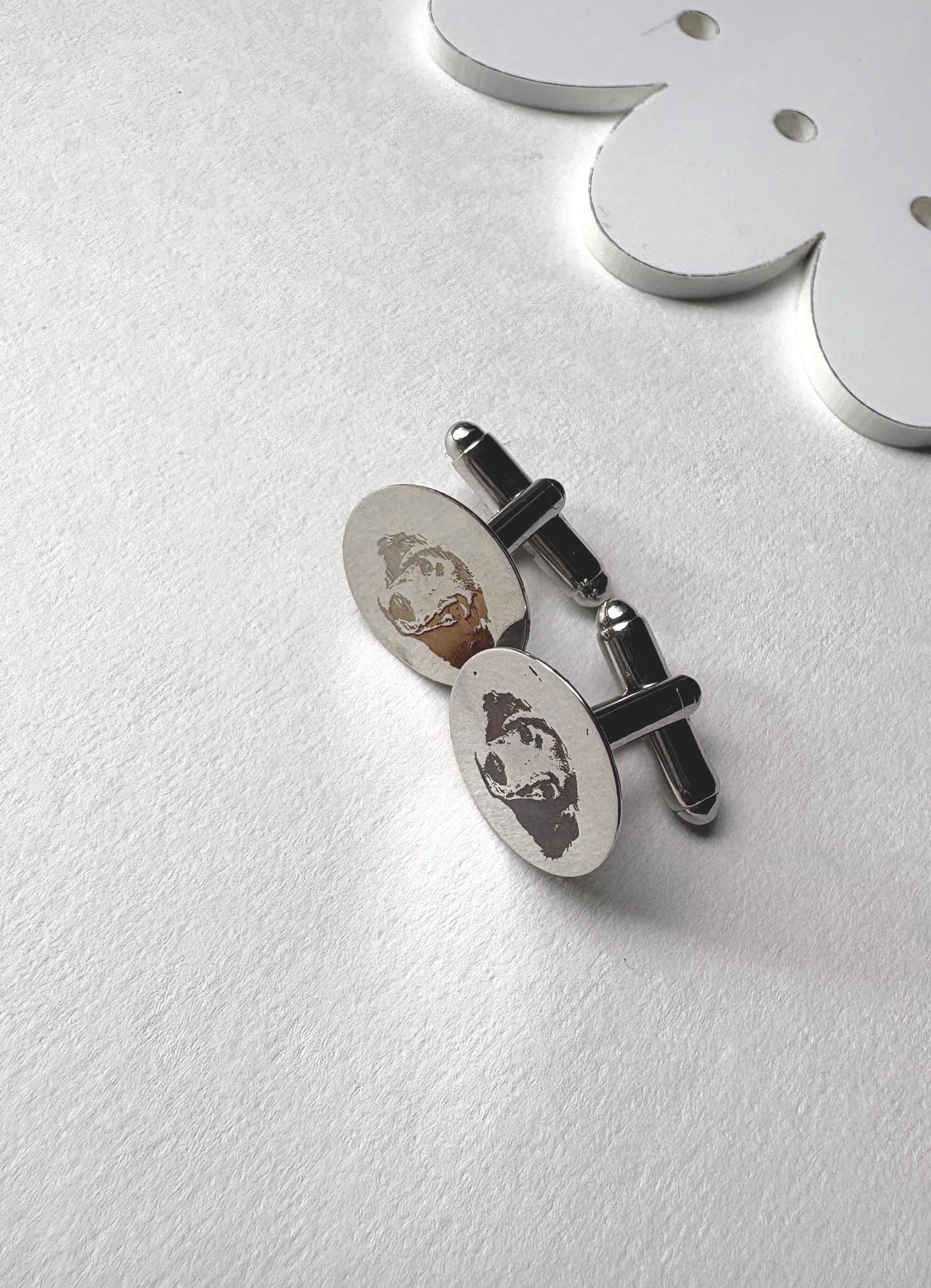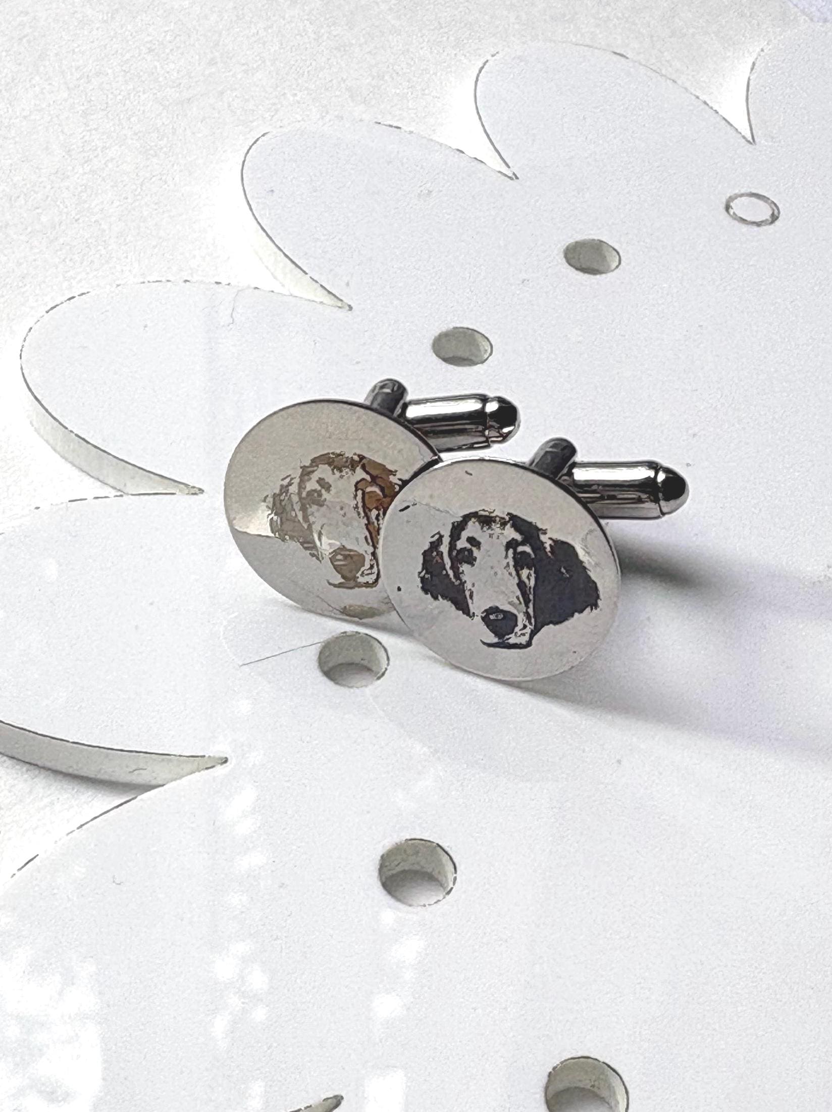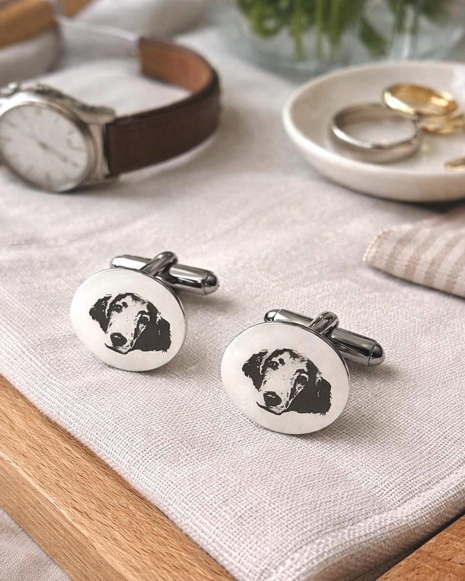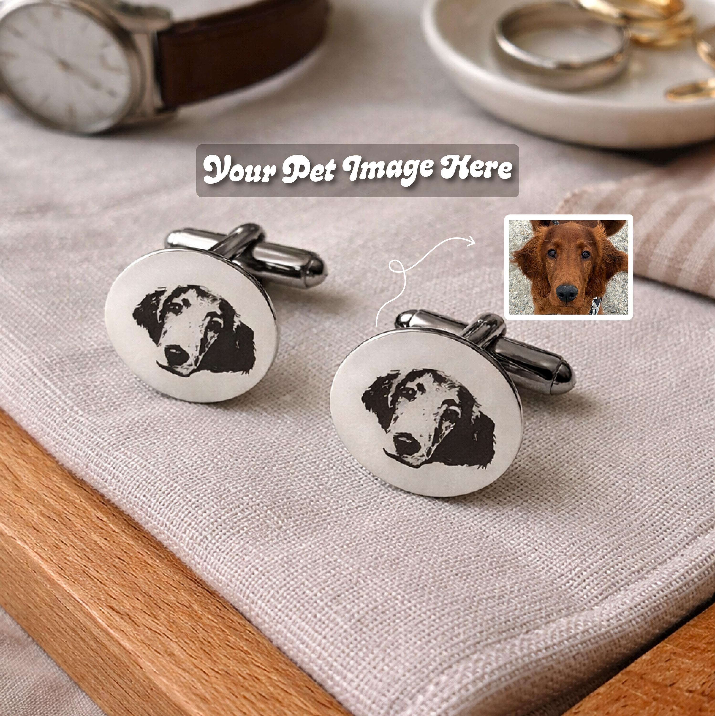 Personalized Engraved Dog Cufflinks – Custom Pet Portrait Cufflinks – Memorial Gift – Wedding / Groom Gift – Stainless Steel Celebrate your best friend in a subtle, elegant way with these custom engraved cufflinks. Each pair is carefully laser engraved with your dog’s portrait, creating a timeless keepsake that is both meaningful and wearable. Whether you're honoring a beloved companion, gifting a dog lover, or adding a personal touch to wedding attire, these cufflinks make a truly unforgettable piece. ✦ Product Details • Material: High-quality stainless steel • Finish: Polished silver tone • Engraving: Precision laser engraved (permanent, will not fade) • Shape: Classic round face • Includes: One pair of cufflinks ✦ Perfect For • Dog lovers & pet parents • Memorial / remembrance gifts • Wedding & groom gifts • Anniversary & birthday gifts • Everyday sentimental wear ✦ How to Order Send your pet photo via Etsy message after purchase High-contrast, clear photos work best Your design will be engraved exactly from your image