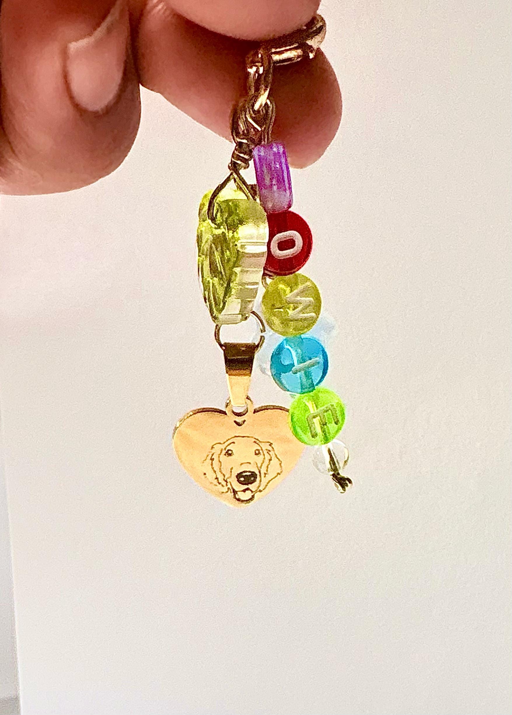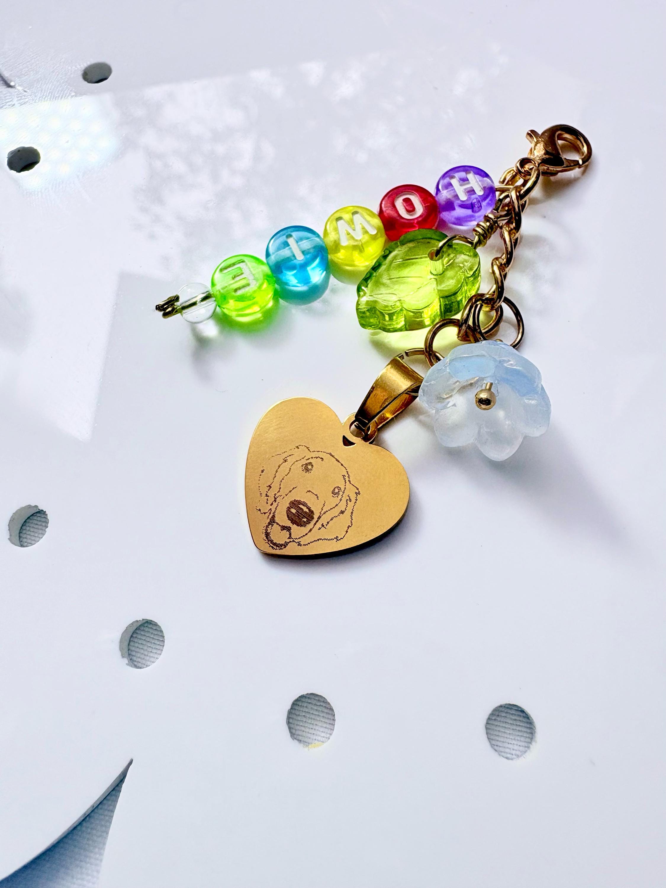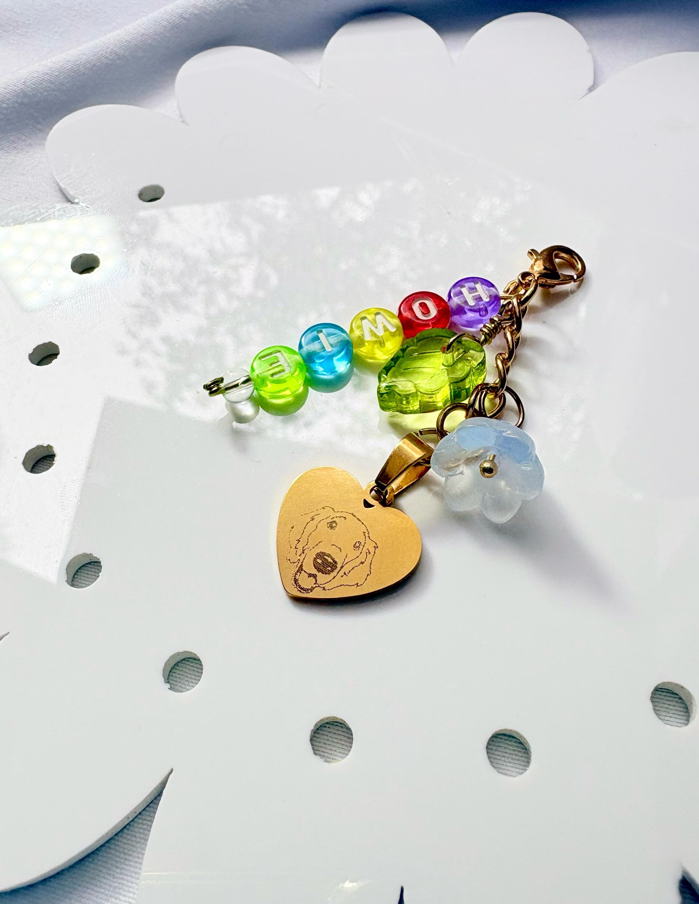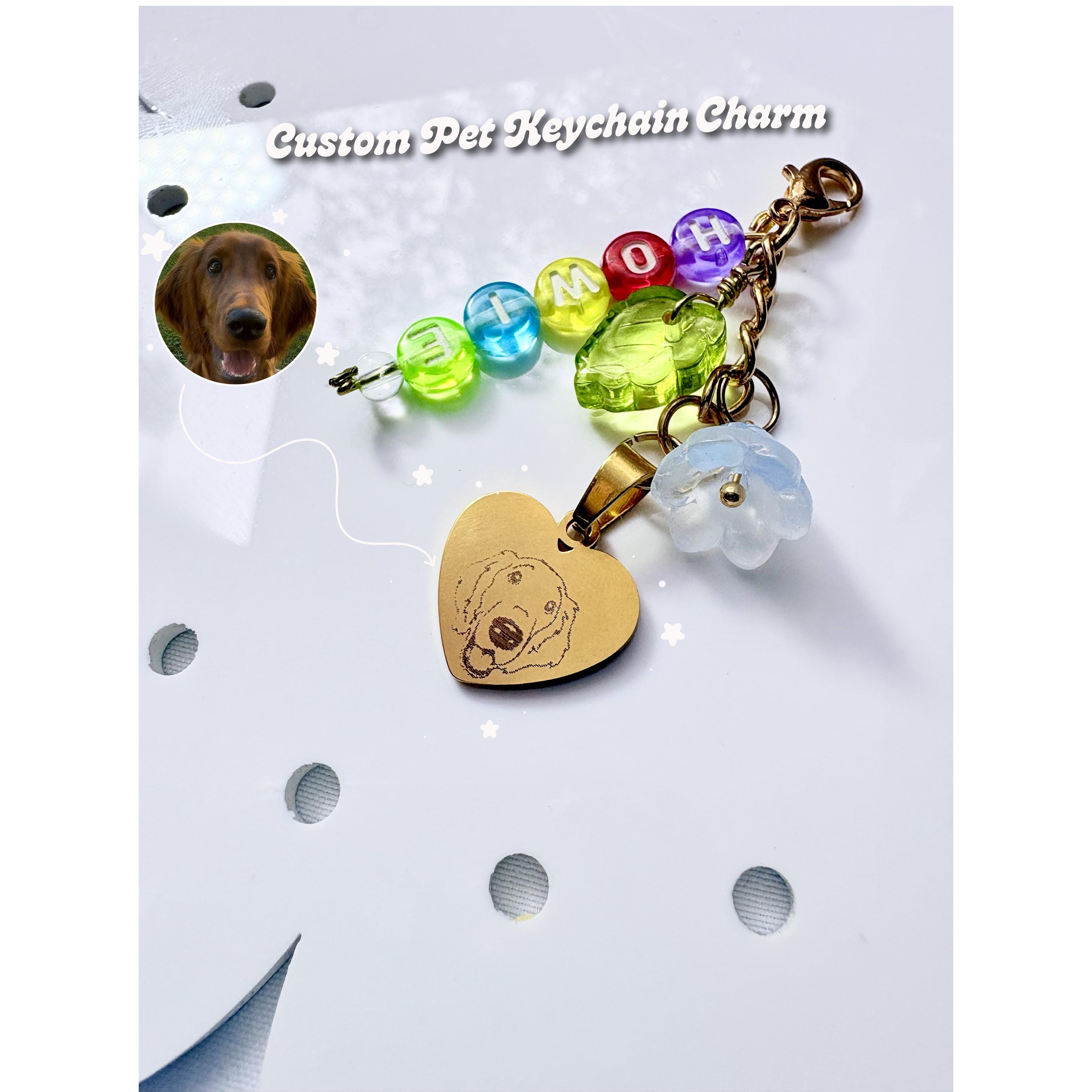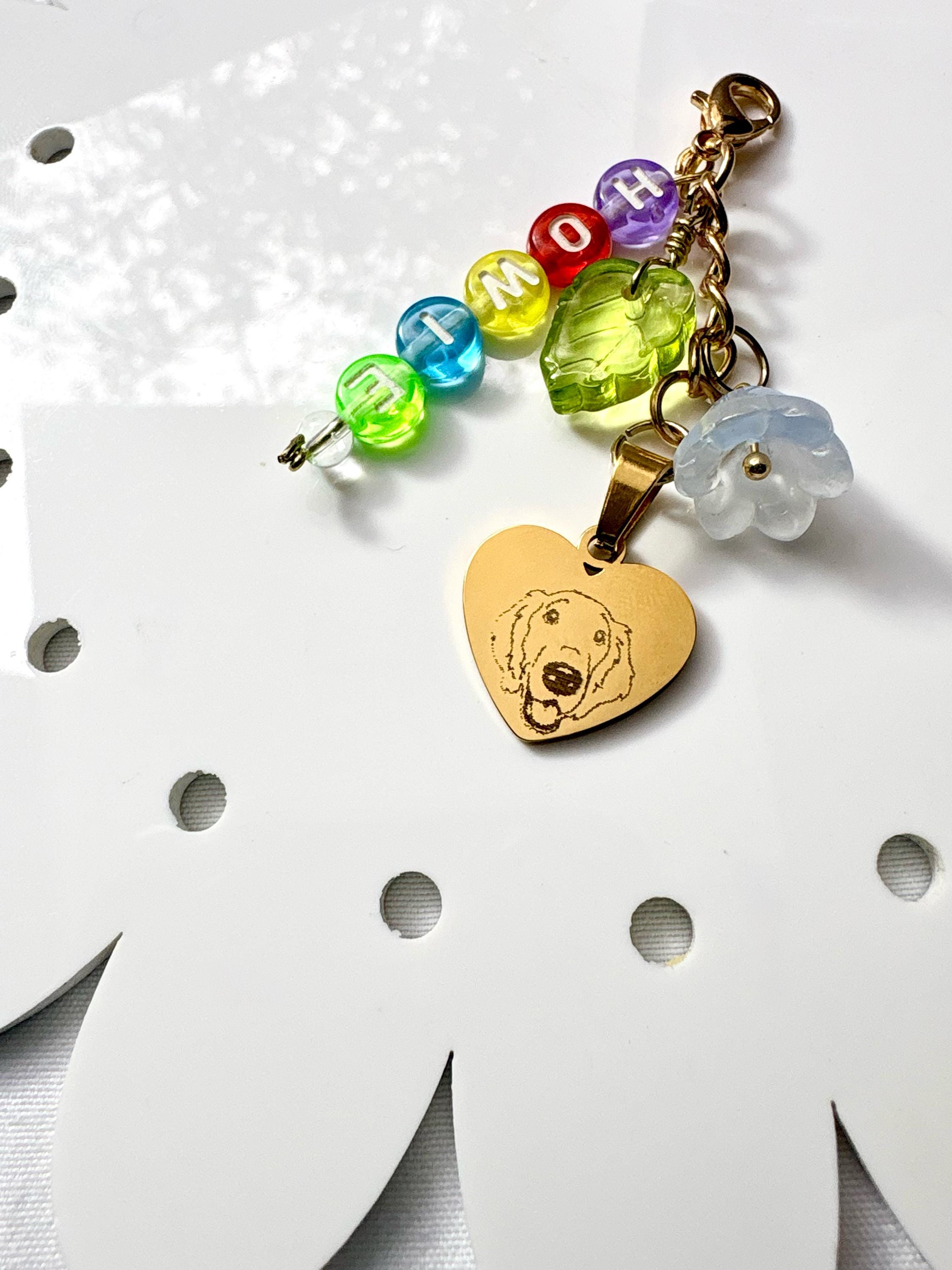 The cutest pet key chains are handmade! This heart pendant key chain is for all animal lovers. Each key chain comes engraved with a Brass heart pendant that is laser engraved with your selected pet image. Each key chain comes with randomized flower charms and your selection of a name add on. d
